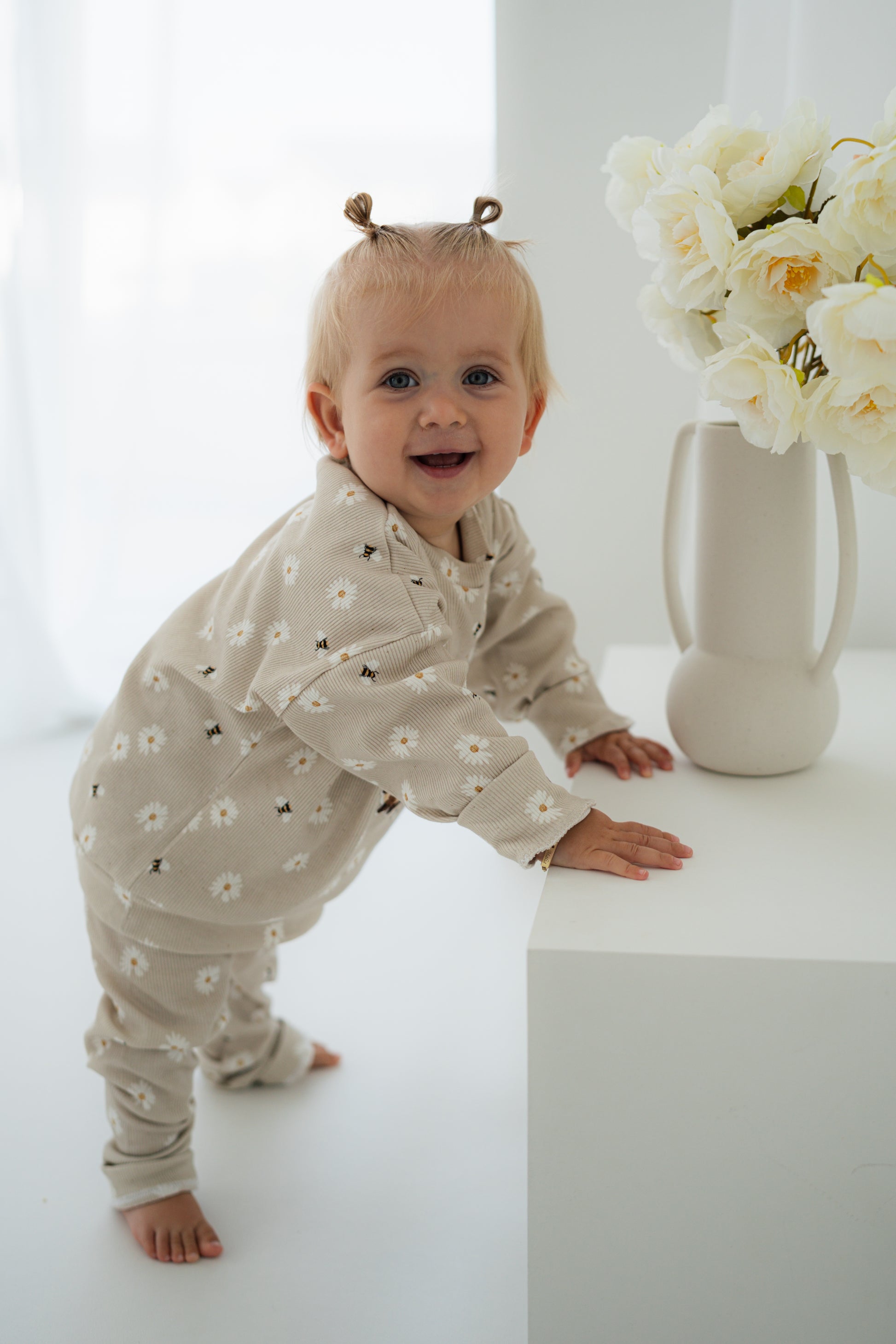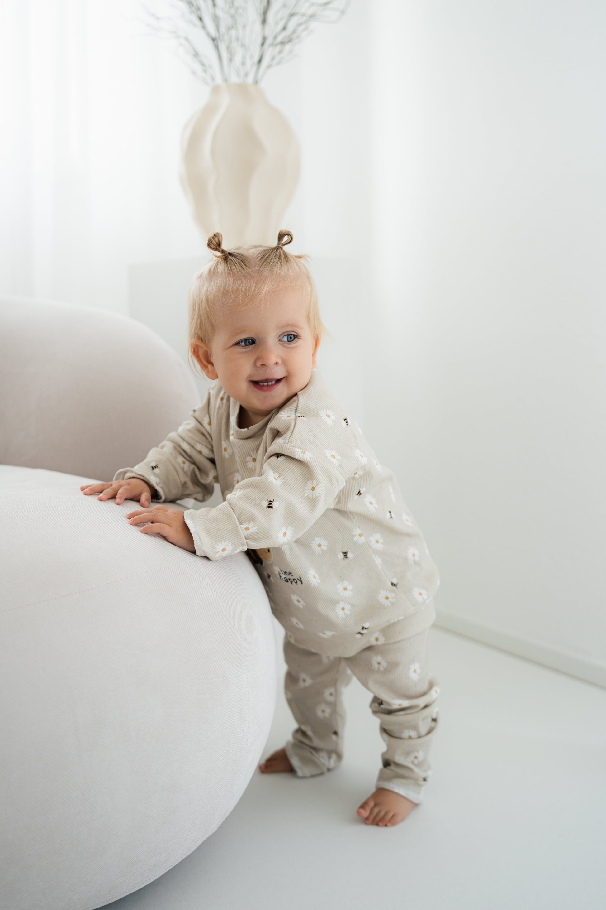 Der weiche, Stoff sorgt für höchsten Tragekomfort und macht das Set zum perfekten Begleiter für den Alltag. Die zarte beige Grundfarbe ist mit kleinen weißen Gänseblümchen verziert, während auf der Vorderseite ein niedliches 3D-Bienenmotiv mit der Aufschrift „bee happy“ für gute Laune sorgt.