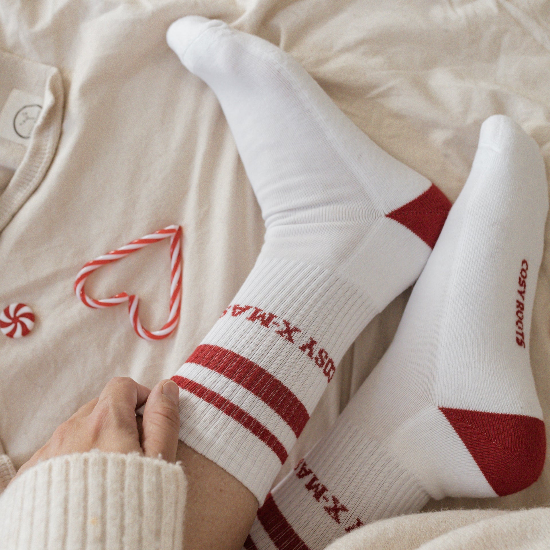 Nachhaltige Unisex Socken mit festlichem Schriftzug “Cosy Christmas” in der weihnachtlichen Farbe rot.