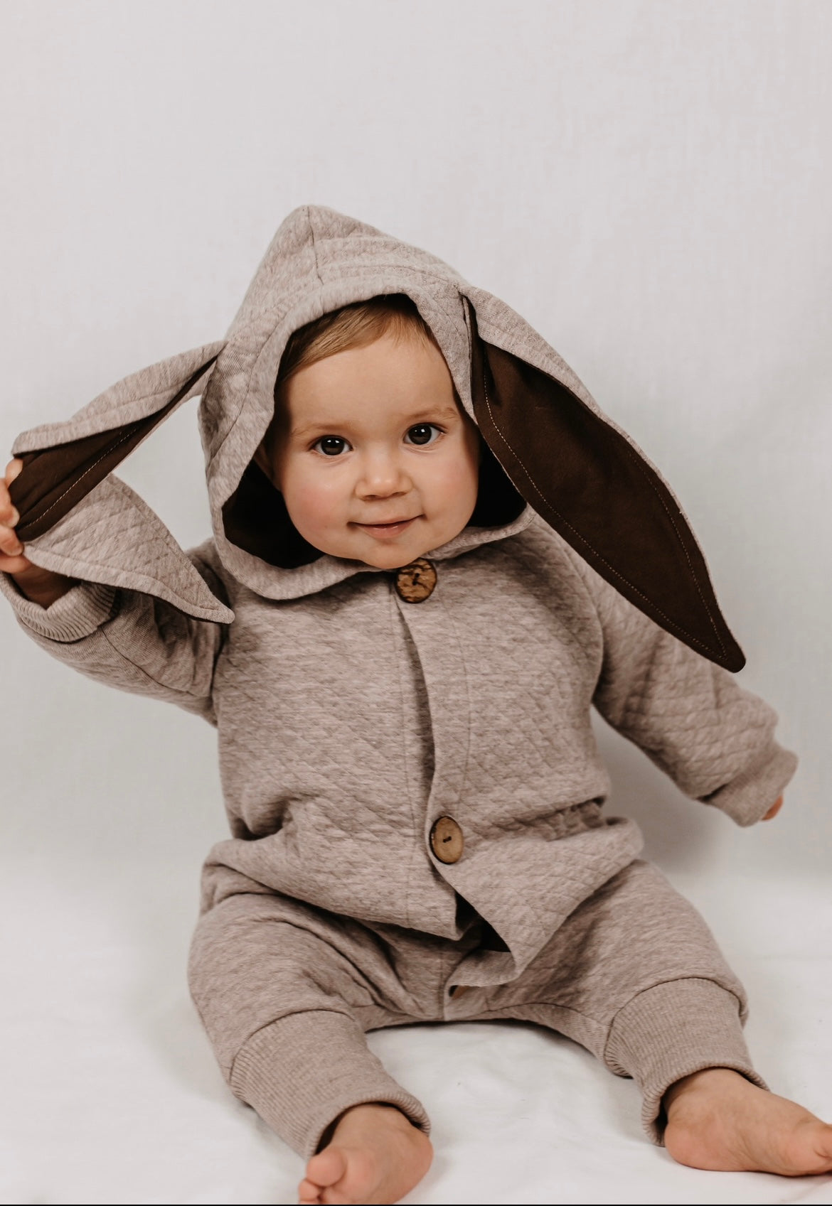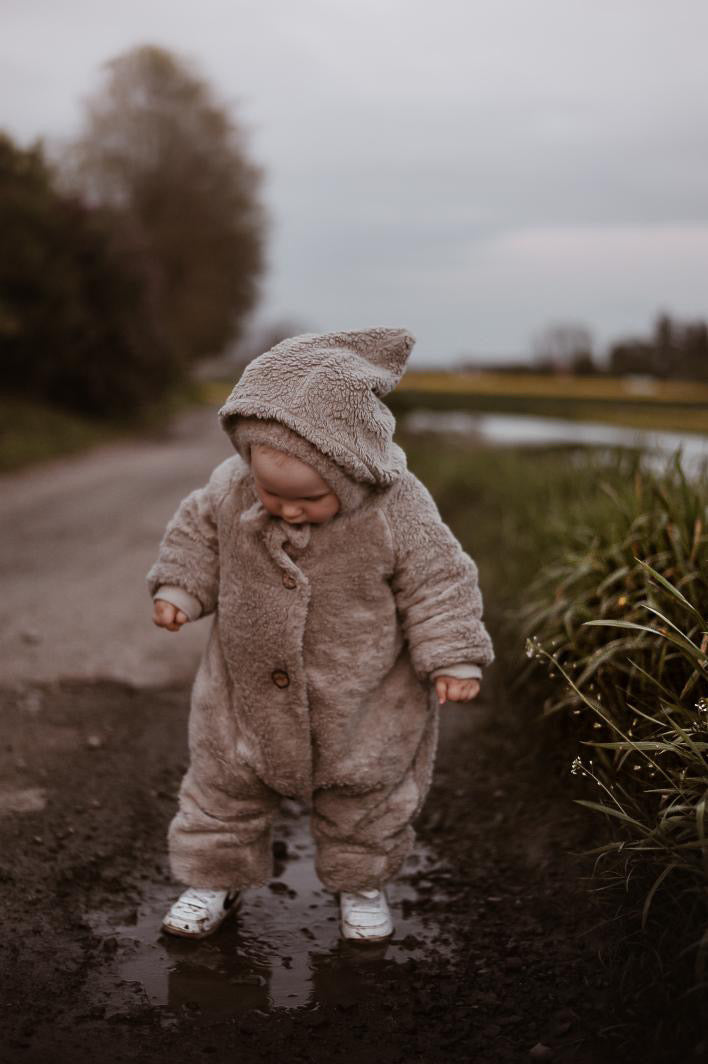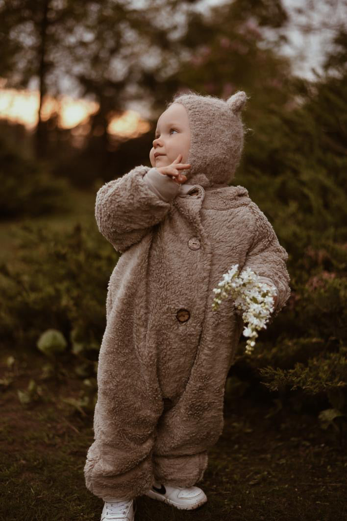 Niedliche, super kuscheliger Overall. Du kannst wählen ob du ihn mit Hasen, Bären oder ohne Ohren haben möchtest.