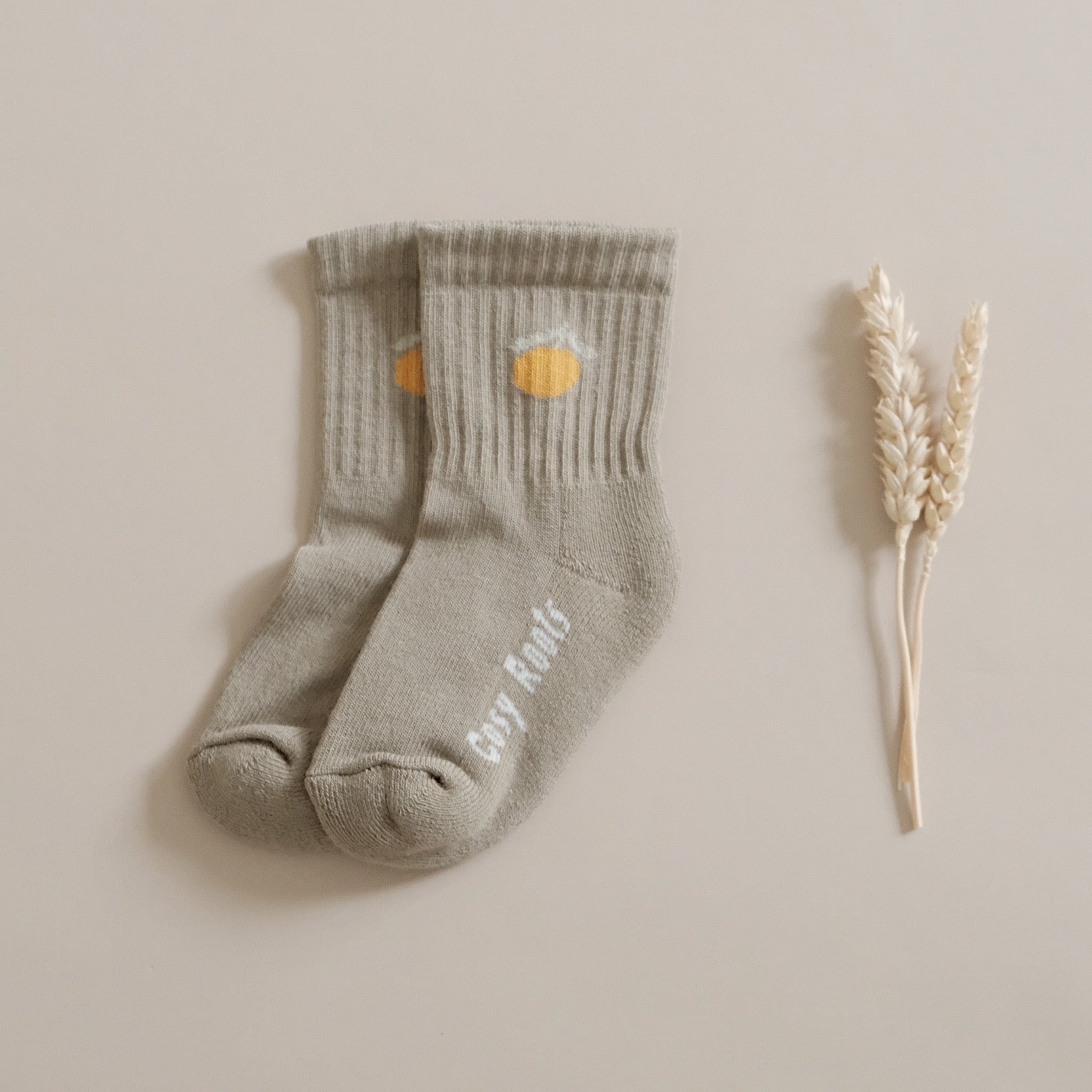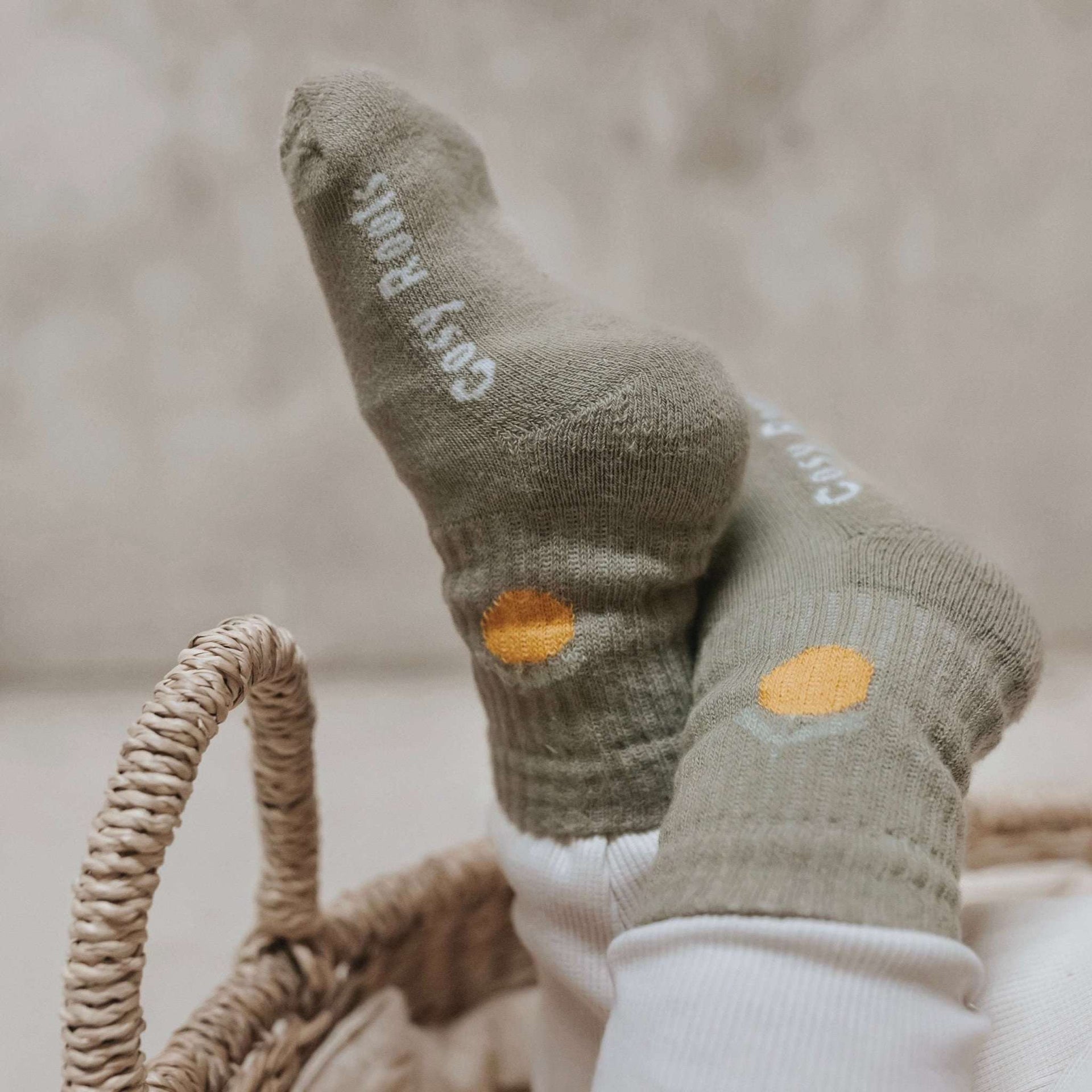 Nachhaltige Socken in unserer exklusiven Farbe Khaki und unserer wunderschönen Zitrone am Bund. Runde dein Outfit perfekt ab.
